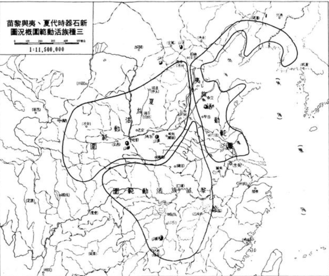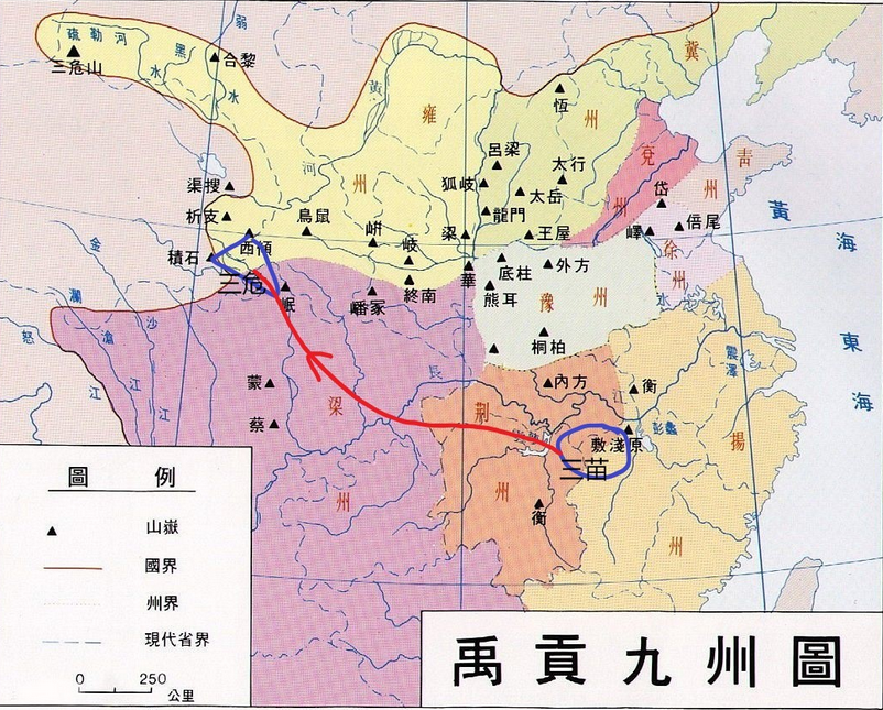 涿鹿大战九黎部族败退后,首领蚩尤牺牲,九黎一部分融入了黄帝族,一部分向南方迁移,来到了长江流域。这些人在经过几百年的生产发展后,至尧、舜、禹时期,他们又强盛了起来,建立了强大部落联盟或国家,这就是 “三苗”,或者我们以中原为正统,称其为“苗蛮集团”。总体来说,三苗集团的生活区域大致在湖北、湖南、江西这一个区域。