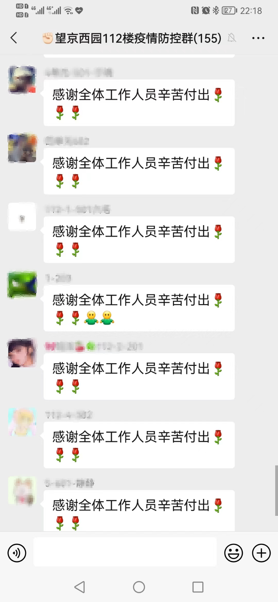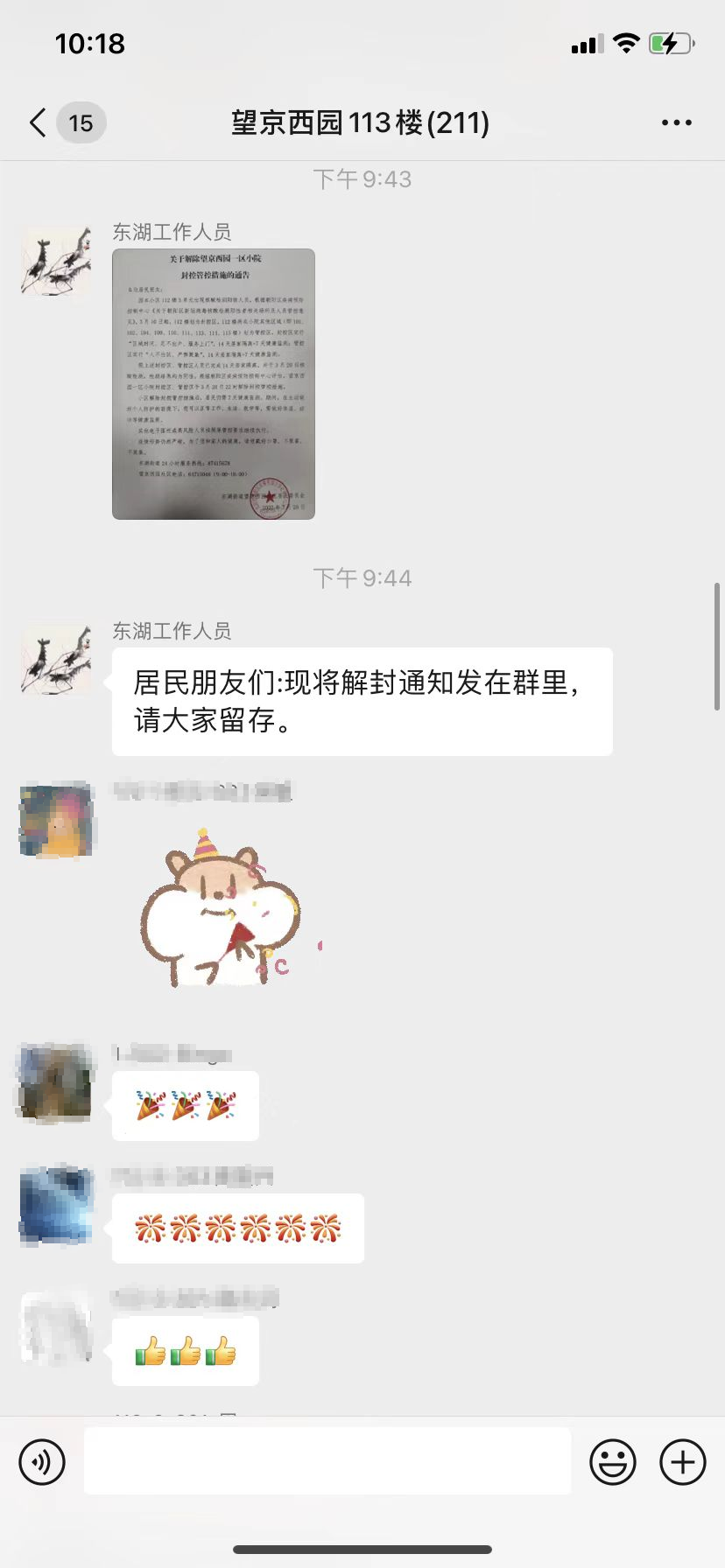 3月20日,望京西园一区小院(即101、102、104、109、110、111、112、113、114、115楼)最后一轮全员核酸检测结果均为阴性。经市、区疾控部门综合研判决定,小院10栋楼正式解除管控封控。东湖街道应急指挥部通过管控区封控区11个微信楼群向居民及时发布了《关于解除望京西园一区小院封控管控措施的通告》。
