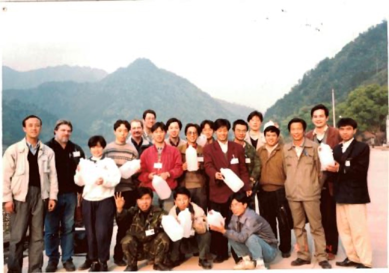 农夫山泉建德工厂生产线第一次吹瓶即获成功,员工们拿着带有手柄的4L空瓶合影。