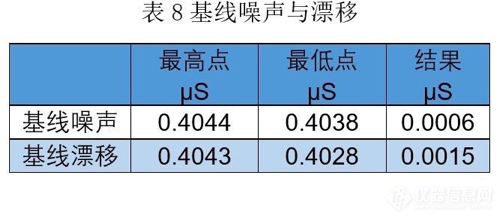笔者使用离子色谱仪实际测试了不同纯净水的背景电导,本文以KOH淋洗液为例,未使用碳酸钠淋洗液(因为碳酸盐体系配制过程中使用药品,担心引入污染导致电导高,所以未进行测试),通过PEEK高压泵将纯净水泵入淋洗液发生器(不接净化柱),在线产生10mM KOH,以反压管代替色谱柱,连接抑制器、电导池模拟真实运行环境,待基线稳定后,采集并记录10分钟基线。以下是结果。