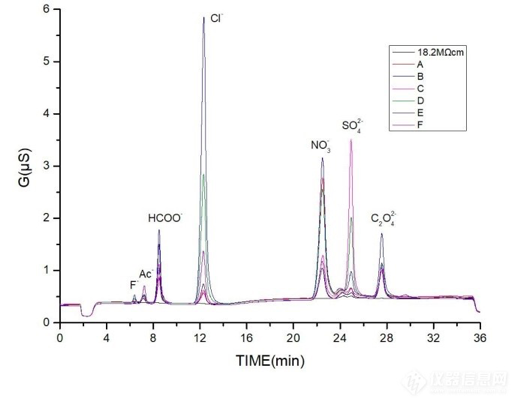 背景电导高低不同说明水中的电解质含量不同,那么具体含有哪些离子呢?笔者在工作之余,使用离子色谱仪对图1中几种饮用纯净水中的阴离子含量做了一次检测,检测离子包括:F-、CH3COO-、HCOO-、Cl-、NO2-、NO3-、SO42-、C2O42-。除了硝酸盐外其它离子检测限均小于0.1μg/L,检测结果显示不同品牌纯净水离子含量差别较大,其中氟离子含量0.07~1.55ppb;乙酸盐含量5.22~29.01ppb;甲酸盐含量14.44~43.54ppb;氯离子含量7.34~205.16ppb;硝酸盐含量51.06~228.57ppb;硫酸盐含量1.15~77.37ppb;草酸盐含量16.24~38.98ppb。推荐A、C、E、F品牌用于离子色谱使用,优先推荐E品牌。