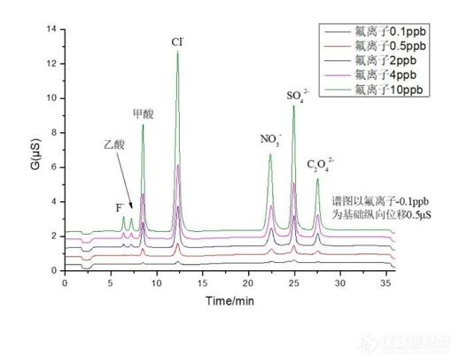 以F-:0.5ppb浓度点和0.0006μS基线噪声为基础数据,按三倍基线噪声计算检测限如表9