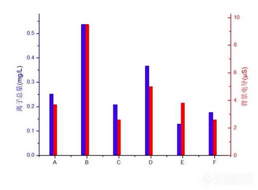 图8 各品牌饮用纯净水的已测阴离子总量及背景电导